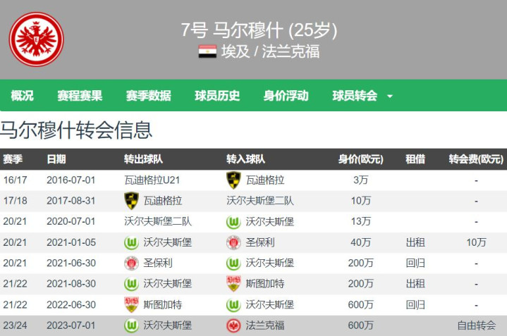 马尔穆什于2023年夏窗以自由转会的方式从沃尔夫斯堡加盟法兰克福,仅过去1年半,法兰克福就赚上了7500万欧元,真是大赚一笔。